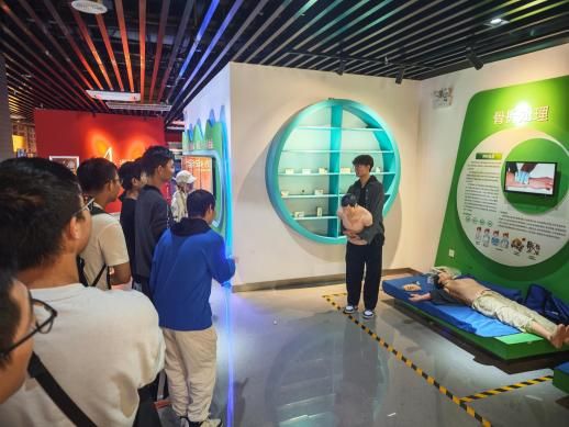 在专业讲解员的带领下,同学们依次参观了用电安全、实验室安全、消防安全、医疗急救等多个主题展区。用电安全展区里,讲解员结合高压电跨步电压、生活电路安全规范等方面详细讲解用电隐患与防范要点,安全体验平台现场演示了相关隐患可能引发的短路、火灾等后果。作为伟德国际1946官网本科生,实验室安全模块是此次学习的重点。在实验室隐患排查区,通过模拟演示,同学们学习了应急处理强酸腐蚀的操作流程,同时还掌握了不同类型化学试剂的储存禁忌。安全教育馆现场演示了机械伤害体验区的高速卷入模拟装置,让大家直观感受到实验中违规操作机械的严重危害,进一步强化了实验操作中的规范意识。消防安全展区内,平台模拟了灭火体验区实操使用灭火器,同学们掌握了“提、拔、握、压”的灭火操作要领。同时还观看了楼宇自动灭火系统演示,系统学习了消防安全标识识别、火灾报警电话使用等知识。在急救学习区,专业医护人员现场演示心肺复苏操作流程,从判断意识与呼吸、开放气道到胸外按压与人工呼吸,每一个步骤都细致讲解。同学们上台实操,在讲解人员的指导下逐步掌握急救技巧。