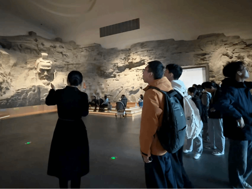 在主题展区,同学们驻足于大型秦汉历史浮雕前。从秦皇汉武的雄图霸业,到寻常百姓的生活百态,浮雕与多媒体光影的融合,使千年历史场景跃然眼前。参观过程中,同学们不时交流探讨,于文物细节中追溯历史脉络,在时代图景中体悟文明传承。