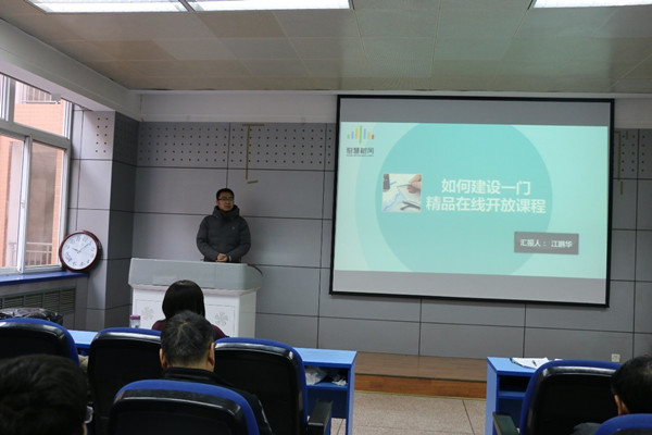 会上,骞爱荣首先针对教务处发布的2019年校级在线开放课程(慕课)建设项目申报工作进行了简单介绍,希望老师结合本次活动,学习经验,积极申请在线课程。接着,智慧树课程顾问江鹏华对在线课程建的建设与运行进行了详细的介绍,并从课程设计、视频制作、教程制作、宣传推广几个方面详细介绍了在线课程制作的经验,并现场回答了教师们在线课程制作过程的相关问题。